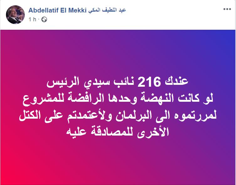و قد ردّ المكّي على تعليق من أحد الأشخاص على هذه التدوينة تساءل فيه هل هذه التدوينة تهديد أم تبرير أم تحذير، قال: ليس تبريرا بل بالعكس هو تحدّي لما قاله الرئيس عن ان النهضة وحدها من يرفض المشروع ان كان الامر كذلك فلتمرره الى البرلمان سيدي الرئيس ولنر ان كانت فعلا وحدها النهضة ترفض تمريره ام لا .