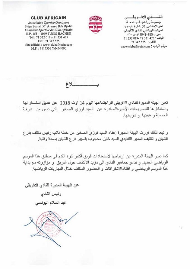 و أشارت هيئة النادي إلى استغرابها و استنكارها من التصريحات الأخيرة لفوزي الصغير التي مسّت من شرف الجمعية وهيبتها وتاريخها، هذه التصريحات هي التي كانت وراء قرار الاعفاء.
