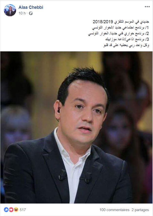و ختم الإعلامي علاء الشابي تدوينته بـ"وكل واحد ربي يعطيه علی قد قلبو" .