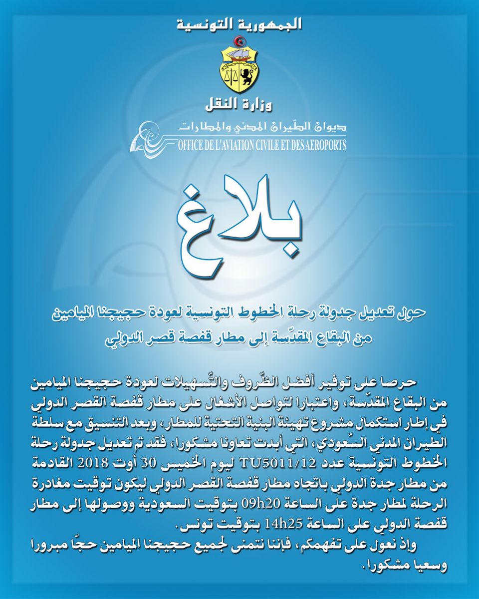 وأوضح الديوان أنه تم تعديل جدولة رحلة الخطوط التونسية عدد 12 /TU5011 ليوم الخميس 30 أوت 2018 القادمة من مطار جدة الدولي باتجاه مطار قفصة القصر الدولي ليكون توقيت مغادرة الرحلة لمطار جدة على الساعة 9 و20 دقيقة بتوقيت السعودية ووصولها إلى مطار قفصة على الساعة 14 و25 دقيقة بتوقيت تونس.