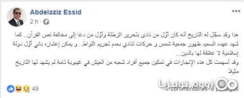 وأضاف الصيد مُستهزئاً، في تدوينة نشرها اليوم الجمعة على حسابه الخاص على الفايسوبك، أنّ "عهده السعيد" شهد ظهور جمعية شمس و حركات تنادي بعدم تجريم اللواط، قائلاً éيمكن إعتباره باني أوّل دولة إسلامية لا علاقة لها بالدين".