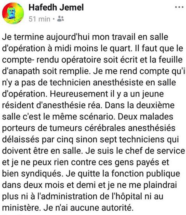 وأوضح الدكتور جمل، في تدوينة نشرها على صفحته الخاصة على الفايسبوك، أن قرار مغادرته وظيفته العمومية يعود إلى غياب فنيي التخدير عن قاعات العمليات بالمستشفى، مشيرا إلى أن ذلك تكرر عدة مرات والحال أنه بصدد القيام بعمليات جراحية لمرضى يحملون أوراما دماغية".