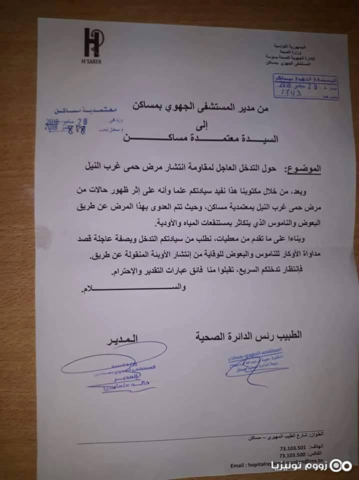 وكانت صفحات على موقع التواصل الإجتماعي الفايسبوك قد تداولت نص مراسلة موجهة من مدير المستشفى الجهوي بمساكن إلى معتمدة الجهة حول ضرورة التدخل العاجل لمقاومة انتشار مرض حمى غرب النيل .