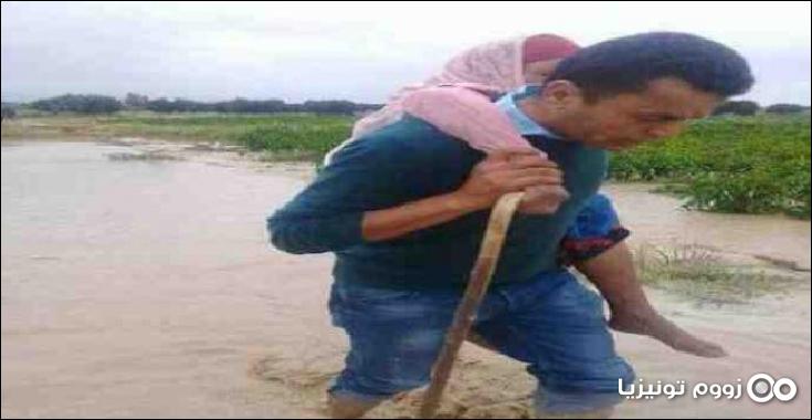 تناقل رواد موقع التواصل الاجتماعي فايسبوك صورة لرئيس مركز الأمن العمومي للحرس الوطني ببئرالحفي النقيب عبد الحفيظ عبد اللاوي و هو بصدد حمل امرأة مسنة على ظهره قصد إنقاذها من الفيضانات في سيدي بوزيد.