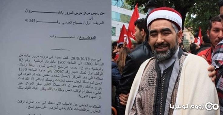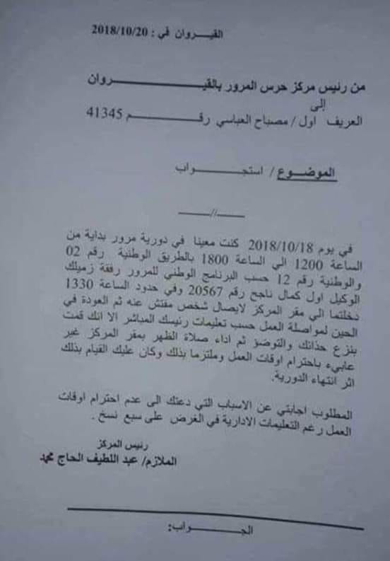 ودعا الحاج محمد العريف أول مصباح العباسي إلى تقديم إجابة عن الأسباب التي دعته إلى عدم احترام أوقات العمل رُغم التعليمات الإدارية في الغرض.
