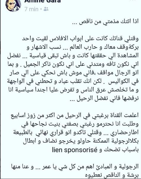 وفي أوّل تعليق له، كشف أمين قارة عبر تدوينة له على حسابه الخاص على الفايسبوك، أنّه سبق وأن أعلم القناة برغبته في الرحيل منذ أكثر من أسبوعين وطلب منهم أن يحترمو رغبته.
