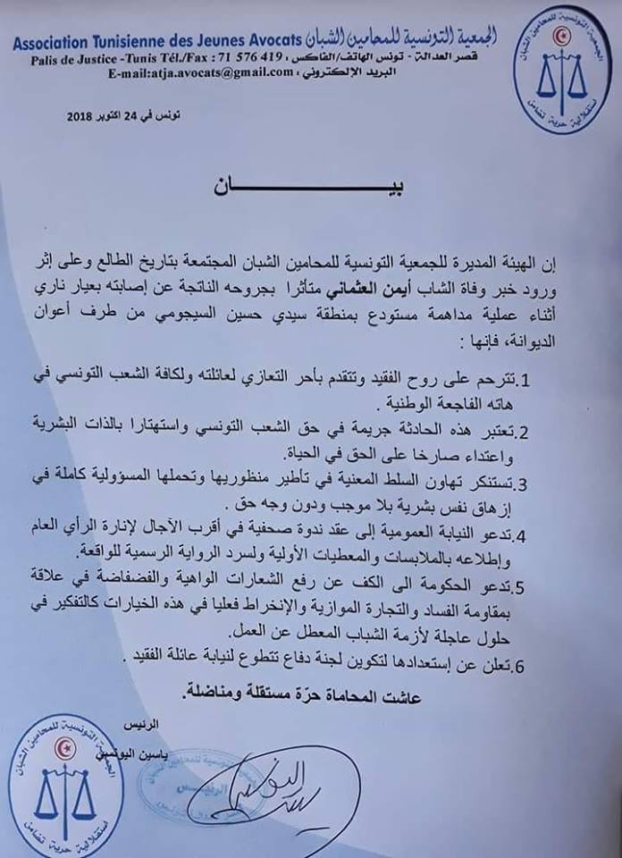 و يذكر أن أيمن العثماني أصيل منطقة سيدي حسين السيجومي توفي الثلاثاء الفارط أثناء مداهمة دورية ديوانية لمستودع بالمنطقة المذكورة، و أن التحقيقات لا زالت جارية لتحديد المسؤوليات.