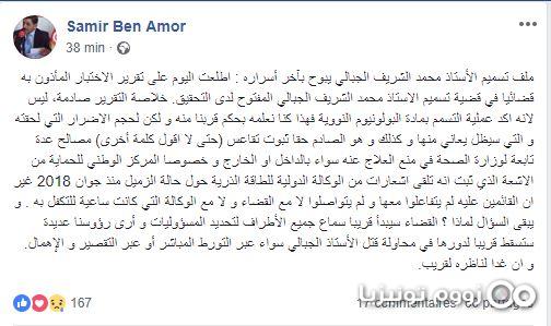 كما أضاف أنّ "الصادم حقا ثبوت تقاعس مصالح عدة تابعة لوزارة الصحة في منع العلاج عنه سواء بالداخل أو الخارج و خصوصا المركز الوطني للحماية من الأشعة الذي ثبت أنه تلقى اشعارات من الوكالة الدولية للطاقة الذرية حول حالة الزميل منذ جوان 2018 غير ان القائمين عليه لم يتفاعلوا معها و لم يتواصلوا لا مع القضاء و لا مع الوكالة التي كانت ساعية للتكفل به"، وذلك وفق نص التدوينة.