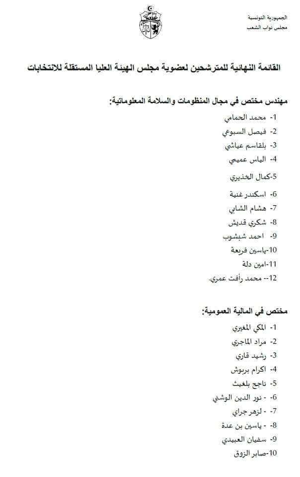 وفي مايلي القائمة النهائية للمترشحين لعضوية الهيئة العليا المستقلة للانتخابات :