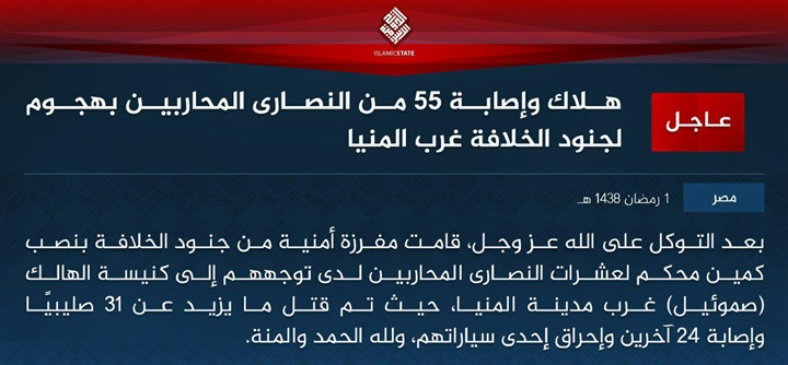 ويأتي هذا الإعلان عبر وكالة أعماق للأنباء الجناح الإعلامي لهذا التنظيم الإرهابي، حيث جاء نص البيان كالتالي " قامت مفرزة أمنيّة من جنود الخلافة بنصب كمين لعشرات النصاري المحاربين لدى توجههم إلـى كنيسة الهالك (صموئيل) غرب مدينة المنيا، حيث تمّ قتل ما يزيد عن 31 صليبياً وإصابة 24 آخرين وإحراق إحدى سياراتهم".