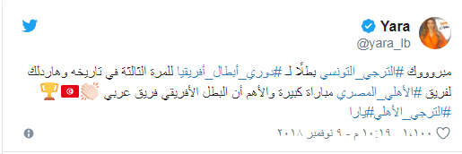 هنأت الفنانة اللبنانية يارا أمس الجمعة، الترجي الرياضي التونسي، بتتويجه بلقب دوري أبطال افريقيا، إثر فوزه على الأهلي المصري بنتيجة 3-0.