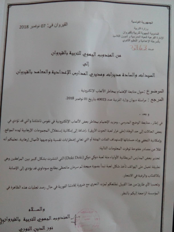 و دعت الوزارة في مراسلة لها المؤسسات التربوية إلى مزيد التحري و ضرورة إشعارها في صورة ملاحظة انتشار هذه اللعبة بين التلاميذ.