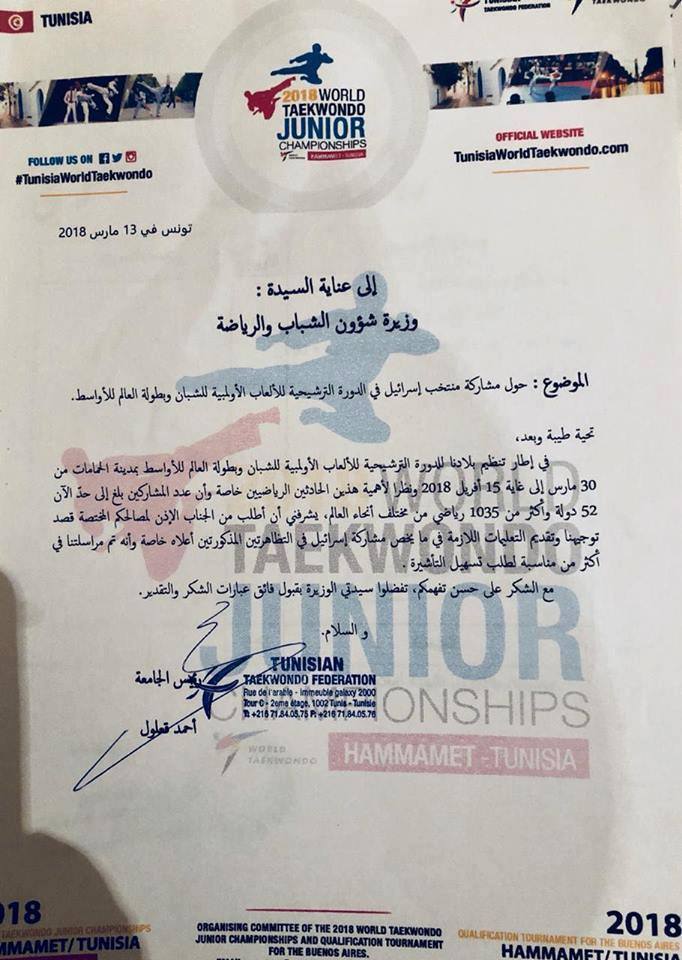 وقد تضمن الوثيقة المسربة طلب أحمد قعلول من وزيرة الشباب والرياضة ماجدولين الشارني توجيه وتقديم التعليمات اللازمة في ما يخص مشاركة منتخب إسرائيل في الدورة الترشيحية للألعاب الأولمبية للشبان وبطولة العالم للأوساط بمدينة الحمامات من 30 مارس الى غاية 15 أفريل 2018 خاصة وأنه تم مراسلة الجامعة أكثر من مرة بخصوص هذا الموضوع لطلب تسهيل التأشيرة.