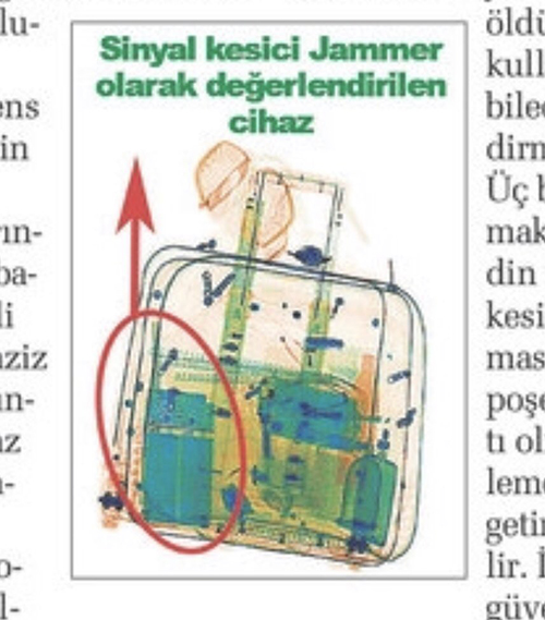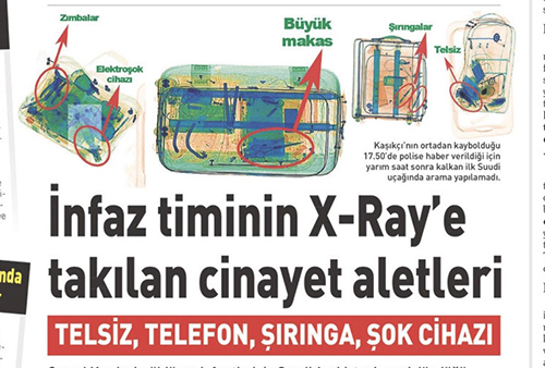 وذكرت صحيفة "صباح التركية" إن أجهزة الفحص بالأشعة السينية في المطار، أظهرت أن الحقائب التي كانت بحوزة الفريق السعودي، تحتوي على مقص كبير، ومشرط، وجهاز صعق كهربائي، وذلك بعد مغادرة المنفذين تركيا.