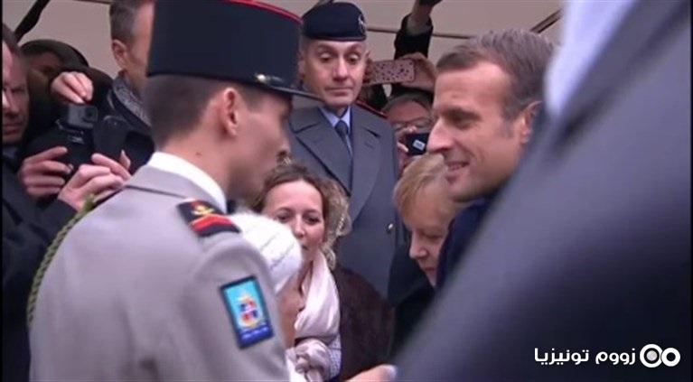 و كان الرئيس الفرنسي يصافح السيدة العجوز عندما توجهت بعد ذلك إلى ميركل ، التي كانت تقف خلف ماكرون،بالسؤال "هل أنت زوجة ماكرون؟"