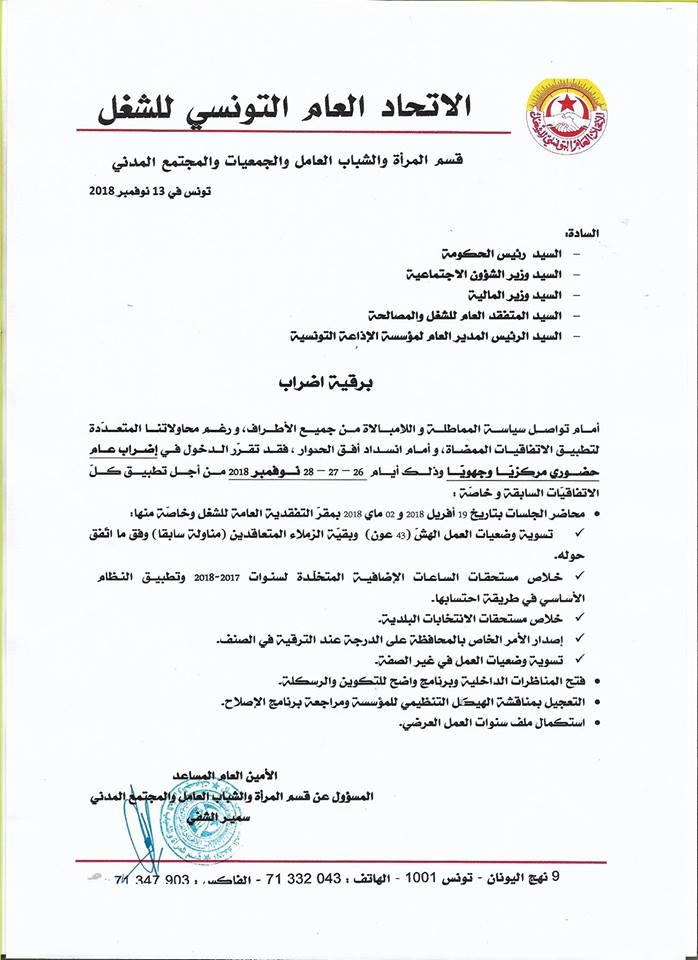وقالت النقابة، في بيان لها، أن الإضراب سيكون أيام 26 و27 و28 نوفمبر ا2018 بمؤسسة التلفزة التونسية.