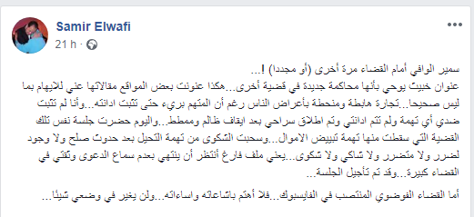 نشر الإعلامي سمير الوافي ليلة أمس الخميس 15 نوفمبر 2018 تدوينة على حسابه الشخصي كذب فيها خبر مثوله أمام القضاء "مجددا" في ملفات جديدة.