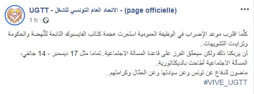 حيث أكد اتحاد الشغل، في تدوينة على صفحته الرسمية على الفايسبوك، أنه كل ما اقترب موعد الإضراب في الوظيفة العمومية "استعرت هجمة كتائب الفايسبوك وتزايدت التشويهات"، وفق تعبيره.
