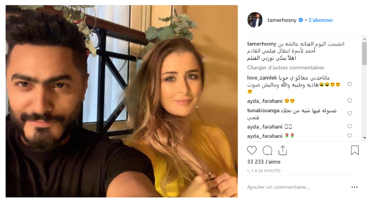 ونشر الفنان المصري يوم أمس صورة تجمعه بالممثلة التونسية وأرفقها بتعليق : "انضمت اليوم الفنانه عائشه بن أحمد لأسرة أبطال فيلمي القادم أهلاً بيكي نورتي الفيلم"