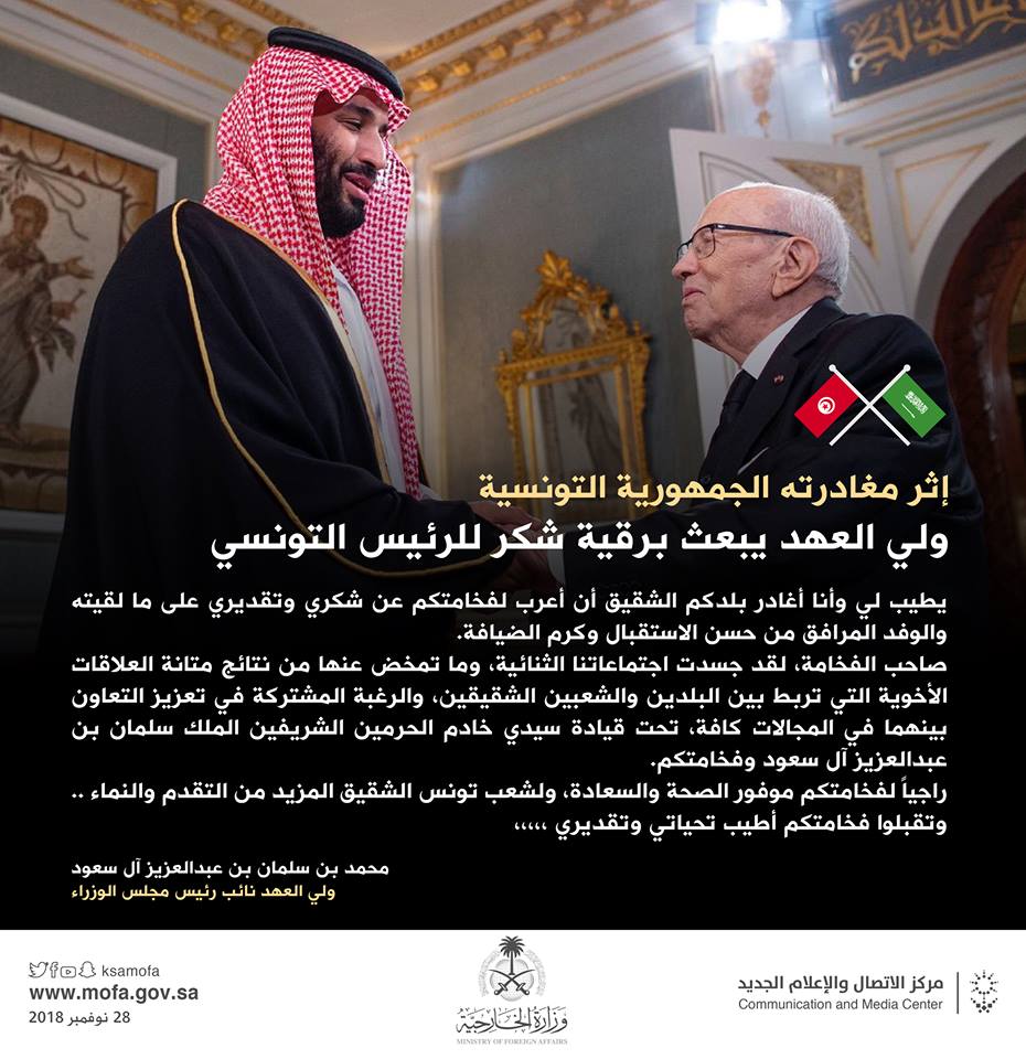 يذكر أن بن سلمان وصل إلى تونس ليلة البارحة و غادرها بعد زيارة دامت أربع ساعات، وسط عدة مواقف رافظة لهذه الزيارة.