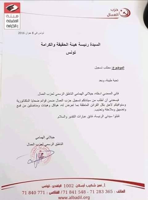 وفي هذا السياق تداول رواد مواقع التواصل الاجتماعي وثيقة تعود لسنة 2016 كان قد طالب فيها الناطق الرسمي لحزب العمال حينها الجيلاني الهمامي تسجيل حزب العمال ضمن قوائم ضحايا الدكتاتورية، وفق نص المراسلة التي بعث بها لهيئة الحقيقة والكرامة.