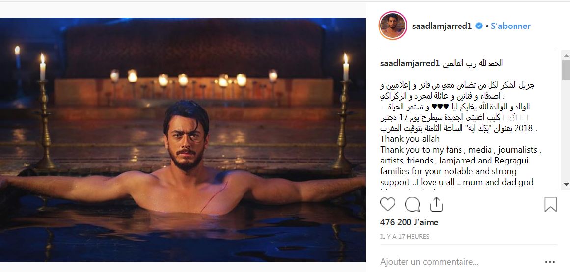 وكتب سعد لمجرد على صورته: "الحمد لله رب العالمين .. جزيل الشكر لكل من تضامن معي من فانز وإعلاميين وأصدقاء وفنانين وعائلة المجرد و الركراكي … الوالد والوالدة الله يخليكم ليا وتستمر الحياة".