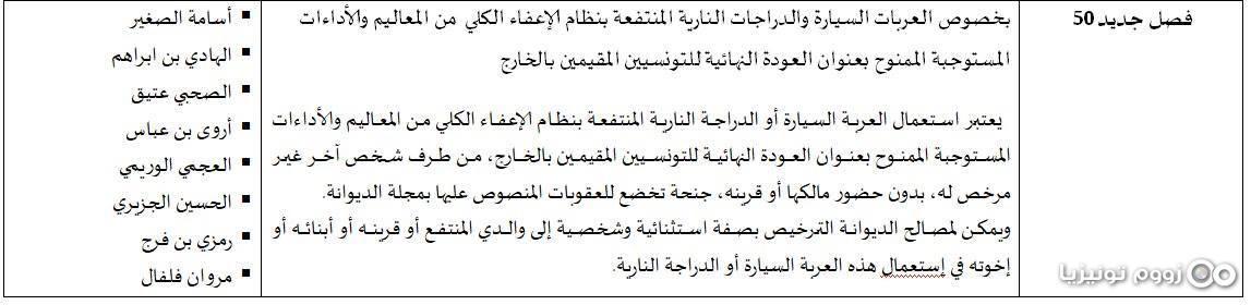 وهذا الفصل الجديد(50) يتعلّق بمنع استعمال العربة السّيارة أو الدرّاجة النّارية المنتفعة بنظام الإعفاء الكلي من المعاليم والأداءات المستوجبة الممنوح بعنوان العودة النهائية للتونسيين المقيمين بالخارج من قبل شخص آخر غير مرخص له دون حضور مالكها أو قرينه.