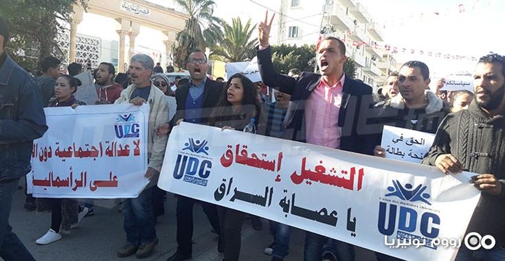 وجابت المسيرة جزء من الشارع الرئيسي لمدينة سيدي بوزيد وتوقفت أمام الحاجز الحديدي المتاخم لساحة الثورة، فيما ندد المحتجون بالوعود الواهية، وفق تعابيرهم.