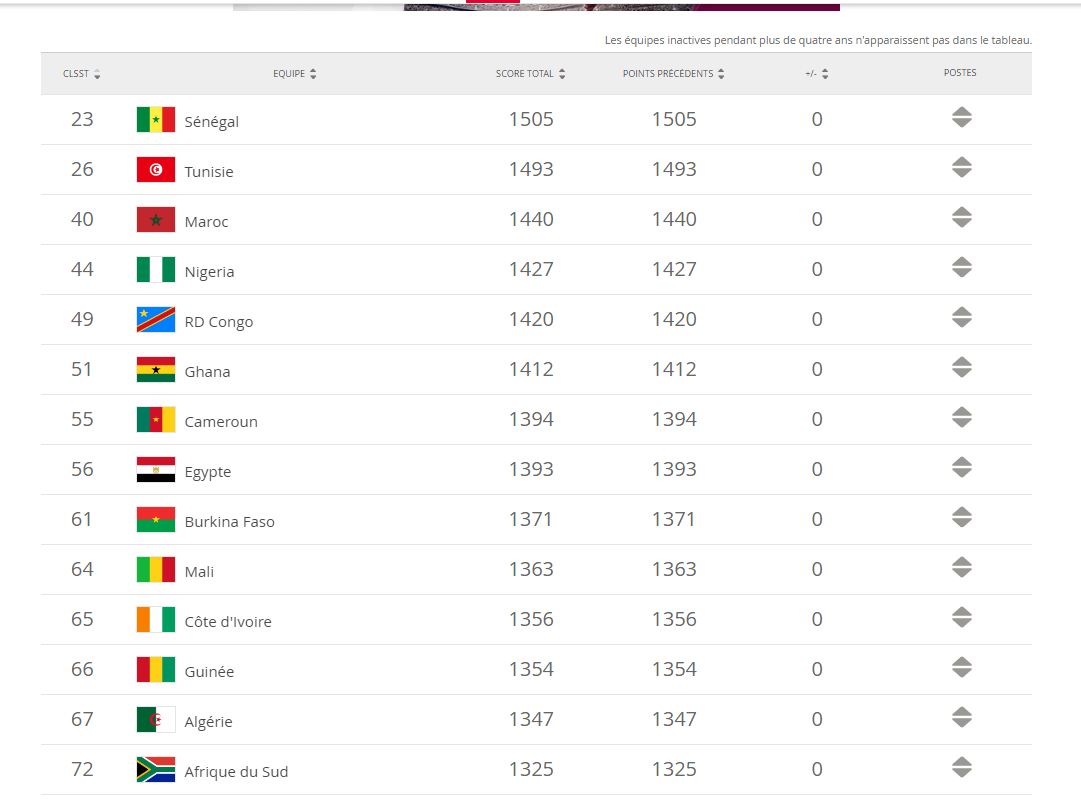 وحافظ المنتخب الوطني التونسي على المرتبة 26، في حين تصدر المنتخبات العربية وجاءفي التريب الثاني بعد منتخب السنغال.