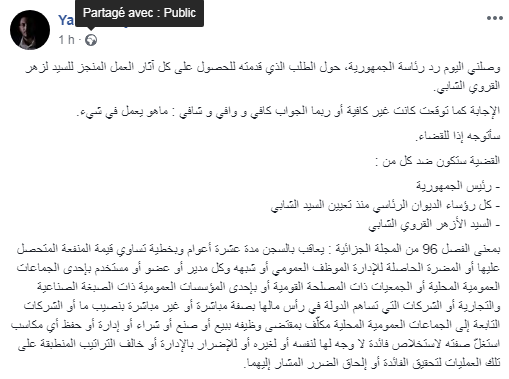 و صرح العياري عبر تدوينة على حسابه الرسمي على فايسبوك أنه سيتجه إلى القضاء على خلفية تلقي "جواب غير كافي" للطلب الذي تقدم به هذا لرئاسة الجمهورية حول المهام الموكلة للزهر القروي الشابي الذي تم تعيينه "وزير مستشار ممثل شخصي لرئيس الجمهورية".