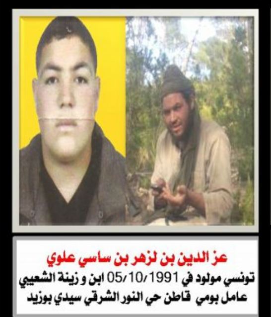 ويشار إلى أن أحد الارهابيين هو عنصر خطير يدعى "عز الدين بن لزهر بن ساسي علوي" هو أحد اللذين فجرا نفسيهما اليوم خلال اشتباكات مع الوحدات الأمنية في جلمة فجر اليوم إثر مداهمة منزل يتحصن به إرهابيون، قلا عن موزاييك.