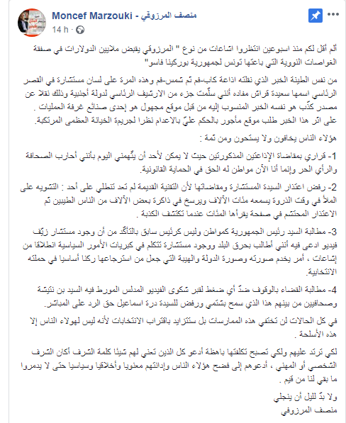 و قال المرزوقي في تدوينة على صفحته الرسمية أن التصريح الذي نسبته قراش لمستشاره السابق عزيز كريشان لا أساس له من الصحة و أن هذا الأخير نفسه كذّب هذا الخبر .
