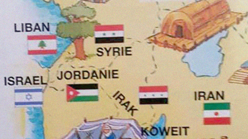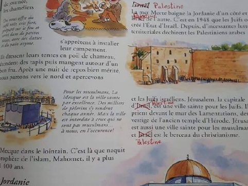 كما ورد بالكتاب الموجه لتعليم اللغة الفرنسية نصا مصاحبا للخريطة جاء فيه "إسرائيل" دولة أسسها اليهود في سنة 1948، و "يقطنها الفلسطينيون العرب واليهود الإسرائيليون".