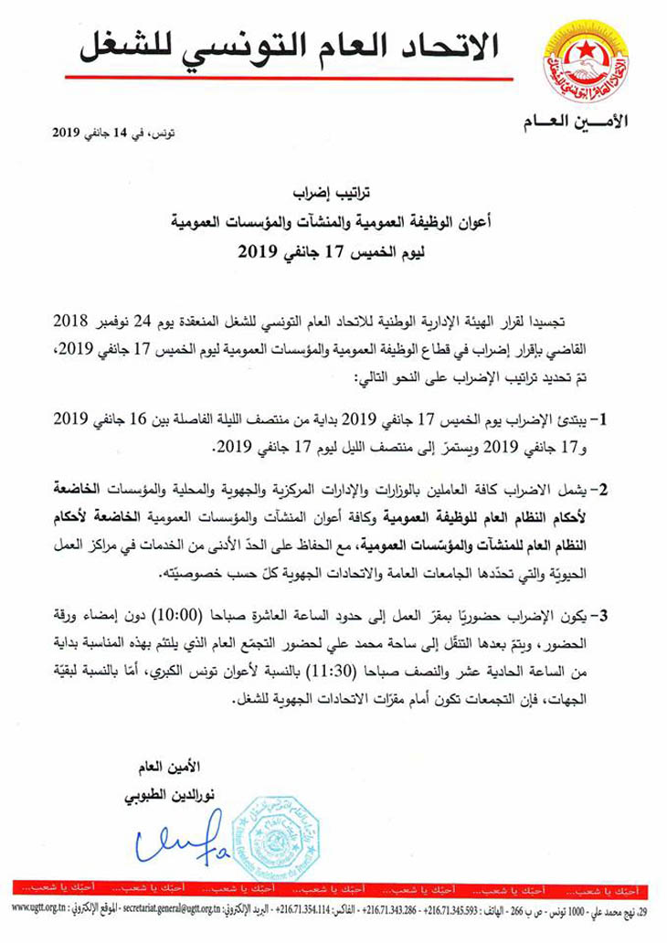 يذكر أن الأمين العام المساعد حفيّظ حفيظ، قد سبق وأكّد بأن آخر آجال للتفاوض مع الحكومة هو اليوم الاثنين 14 جانفي 2019، وفي صورة عدم التوصّل لاتفاق وحلول مع الحكومة بخصوص الزيادة في الأجور فسيتمّ تنفيذ الإضراب العام.