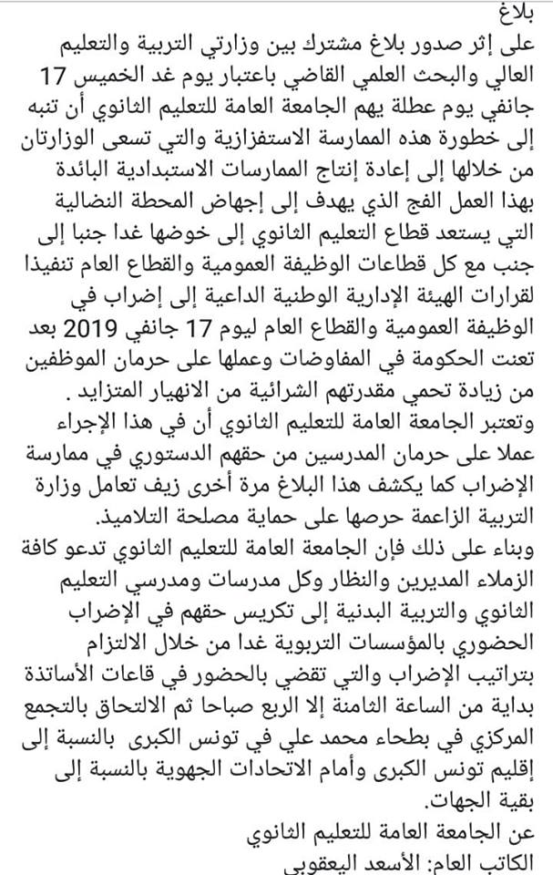 كما أصدرت الجامعة العامة للتعليم الثانوي بلاغًا اِعتبرت فيه أنّ في هذا الإجراء عملا على حرمان المدرسين من حقهم الدستوري في ممارسة الإضراب ويكشف زيف تعامل وزارة التربية.