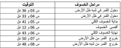 ويعرض الجدول التالي مراحل الخسوف بالتوقيت المحلي: