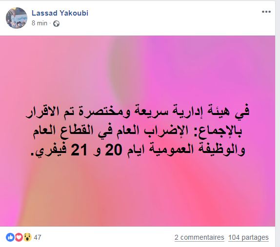 أعلن الكاتب العام للجامعة العامة للتعليم الثانوي لسعد اليعقوبي عبر صفحته الرسمية على موقع التواصل الاجتماعي "فايسبوك" أنّ الهيئة الإدارية لاتحاد الشغل المنعقدة اليوم السبت 19 جانفي 2019 أقرّت بالإجماع الإضراب العام في الوظيفة العمومية والقطاع العام يومي 20 و21 فيفري القادم.