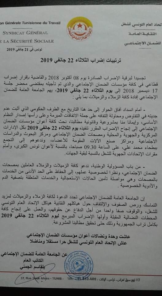 وقد أصدرت النقابة العامة للضمان الإجتماعي، بلاغا تفيد فيه بأن الإضراب جاء تجسيدًا لبرقية تنبيه بإضراب صدرت يوم 8 أكتوبر 2018، والقاضية بتنفيذ إضراب قطاعي بكامل مؤسسات الضمان الإجتماعي.