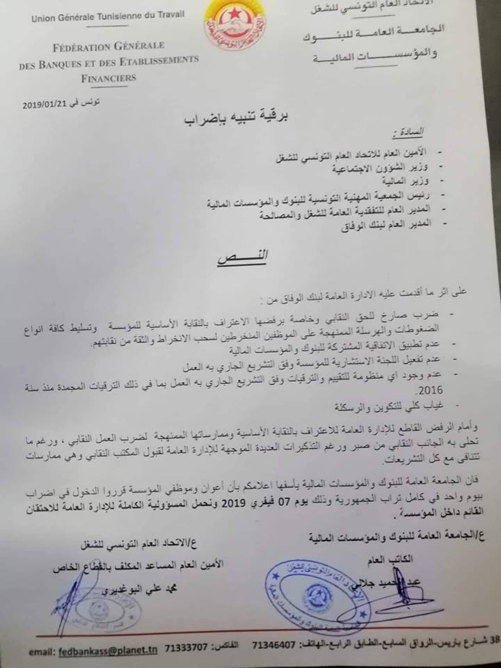 وبينت الجامعة أن أعوان البنك المذكور، قرروا الدخول في إضراب بيوم واحد يوم 7 فيفري القادم بكامل تراب الجمهورية، حتى يتم الإستجابة لمطالبهم المدرجة في البرقية التالية: