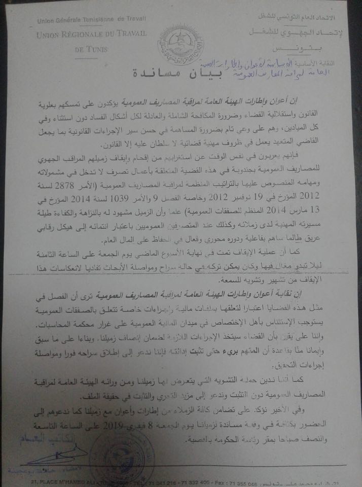 كما أدانت النقابة حملة التشويه التي يتعرض لها زميلهم ومن ورائه الهيئة العامة لمراقبة المصاريف العمومية دون التثبت ودعت إلى مزيد التحري والتثبت في حقيقة الملف.