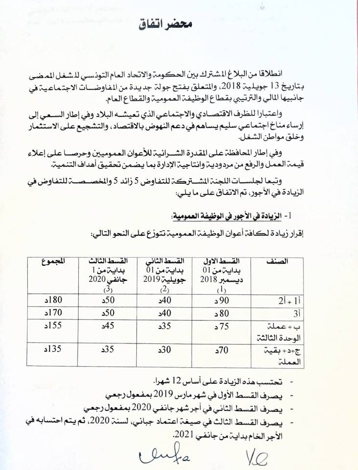نشر الاتحاد العام التونسي للشغل اليوم الجمعة 8 فيفري 2019 محضر الاتفاق الممضي بين الطرفين الحكومي و النقابي بخصوص الزيادة في أجور أعوان الوظيفة العمومية.