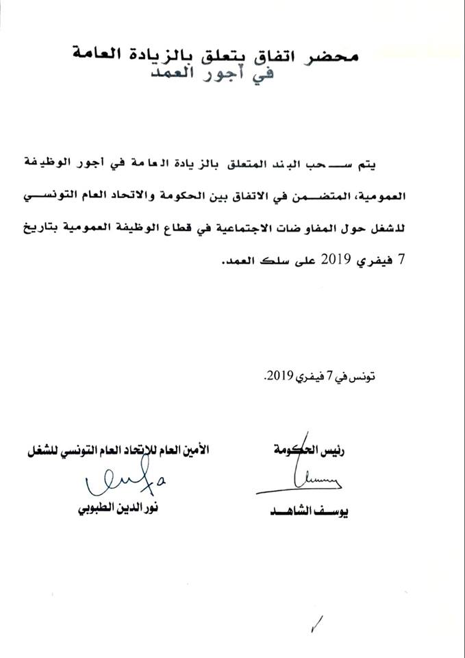 و قد نشر اتحاد الشغل اليوم الجمعة 8 فيفري 2019، محضر الاتفاق المتعلّق بالزيادة في أجور العمد على صفحته الرسمية "فايسبوك"