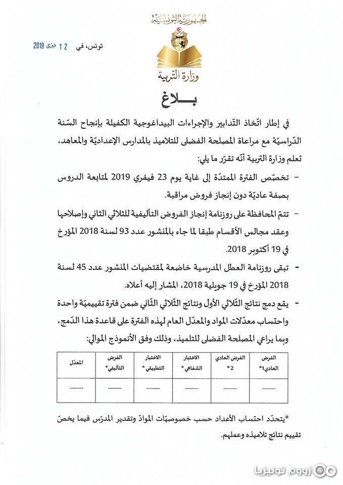 -تخصيص الفترة الممتدة إلى غاية 23 فيفري 2019 لمتابعة الدروس بصفة عادية دون إنجاز فروض مراقبة