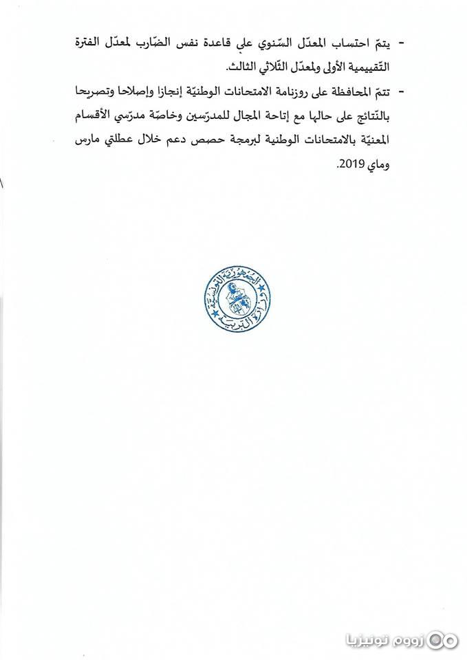 -تتم المحافظة على روزنامة الامتحانات الوطنية انجازا واصلاحا وتصريحا بالنتائج على حالها مع اتاحة المجال للمدرسين وخاصة مدرسي الأقسام المعنية بالامتحانات الوطنية لبرمجة حصص دعم خلال عطلتي مارس وماي 2019.