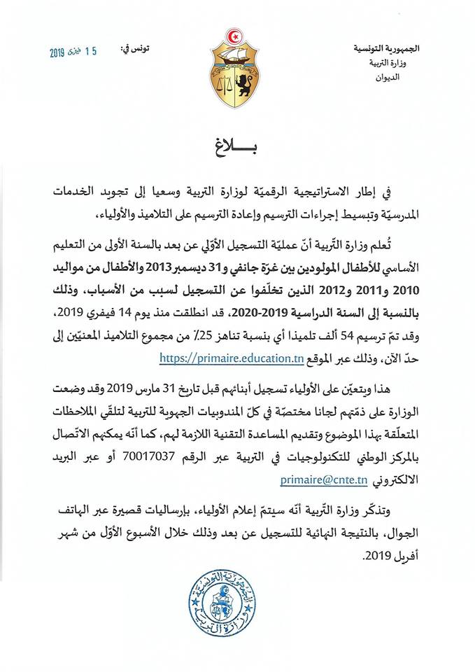 كما أوردت الوزارة في بلاغها، أنه سيتم إعلام الأولياء بإرساليات قصيرة عبر الهاتف الجوال بالنتيجة النهائية للتسجيل عن بعد و ذلك خلال الأسبوع الأول من شهر أفريل 2019.