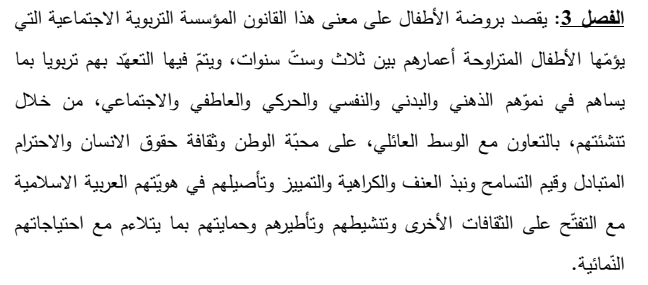 وقد تمّ إسقاط الفصل الثالث من هذا المشروع والمُتعلّق بتأصيل الأطفال المتراوحة أعمارهم بين ثلاث وستّ سنوات في هويّتهم العربيّة الإسلاميّة مع التفتح على الثقافات الأخرى وتنشيطهم وتأطيرهم وحمايتهم بما يتلاءم مع احتياجاتهم النّمائيّة.