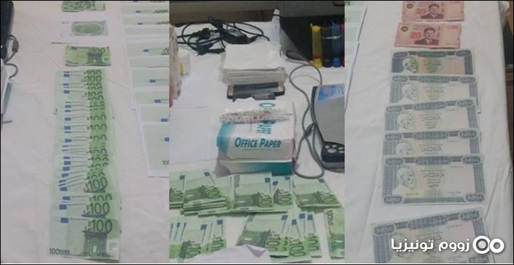 وقد ألقت القبض على شخصين ينشطان ضمن شبكة مختصة في تدليس العملة التونسية والأجنبية وحجزت داخل المنزل جهاز إعلامية وجهاز سكانار وآلة طباعة وكمية من الحبر و118 ورقة نقدية من فئة 100 أورو وورقتين نقديتين من فئة 20 و 50 دينار من العملة تونسية و06 أوراق من العملة الليبية "الجنيه" جميعها مدلسة.