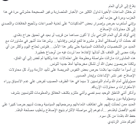 و تابع "حملت أنا وأصدقائي أملا و مشروعا لنفع تونس وإفادتها، وشرعنا منذ أشهر في مشاورات مع العديد من الشخصيات والعائلات السياسية...هذه المشاورات مازالت متواصلة ومفتوحة على احتمالات عدة ولكنها لم تفض إلى أي اتفاق".