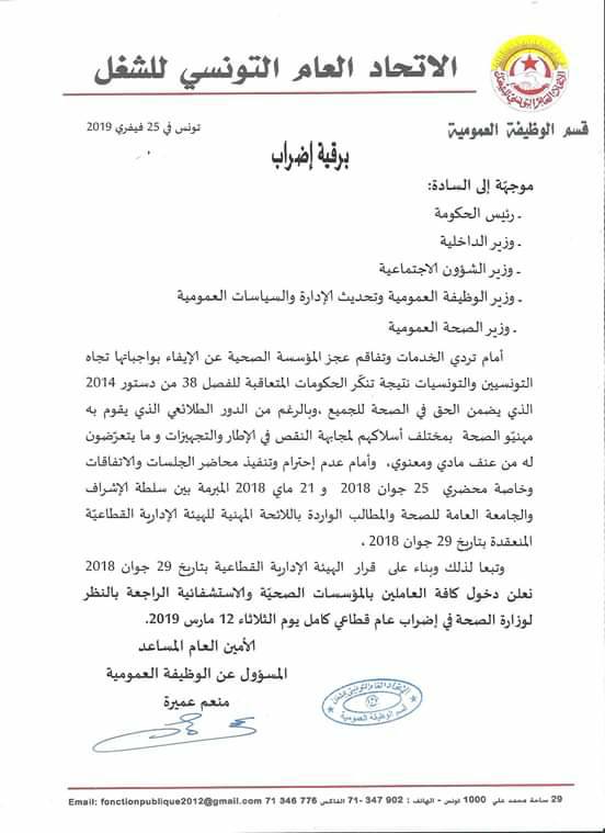 أصدرت، اليوم الإثنين 25 فيفري 2019، الهيئة الإدارية القطاعية للصحة برقية إضراب عام قطاعي يوم الثلاثاء 12 مارس 2019 بكافة المؤسسات الصحية والاستشفائية العمومية الراجعة بالنظر لوزارة الصحة، وذلك "نظرا لعدم احترام وتنفيذ سلطة الإشراف لمحاضر الاتفاقات والجلسات المبرمة بين الجانبين''، وفق نص البرقية.