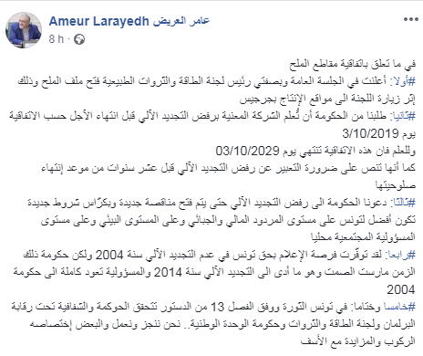 و قال العريض في نص التدوينة أنه أعلن خلال الجلسة العامة وبصفته رئيس لجنة الطاقة والثروات الطبيعية فتح ملف الملح وذلك إثر زيارة اللجنة إلى مواقع الإنتاج بجرجيس، و تابع طلبنا من الحكومة أن تُعلم الشركة المعنية برفض التجديد الآلي قبل انتهاء الآجل حسب الاتفاقية يوم 3/10/2019 وللعلم فان هذه الاتفاقية تنتهي يوم 03/10/2029، كما أنها تنص على ضرورة التعبير عن رفض التجديد الآلي قبل عشر سنوات من موعد إنتهاء صلوحيتها.
